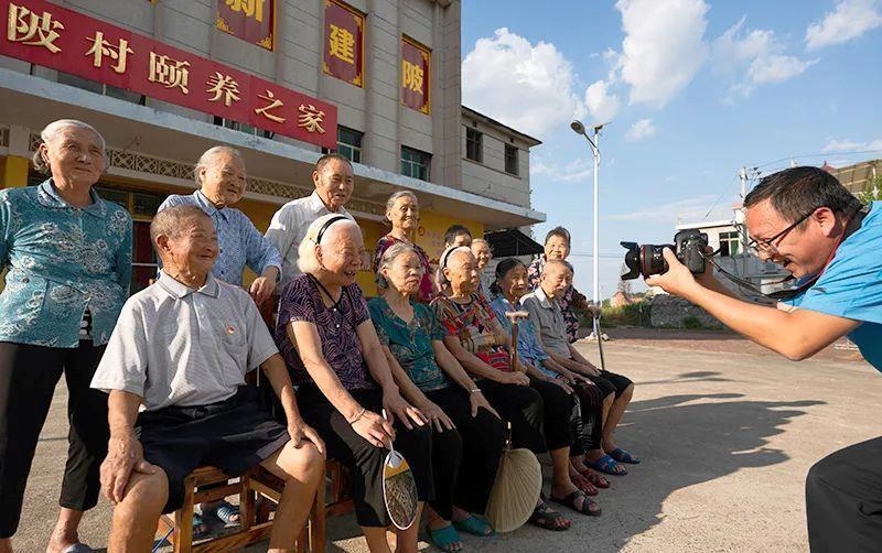 9月14日,青年志愿者为江西省新余市分宜县杨桥镇建陂村“颐养之家”的老人们拍照。