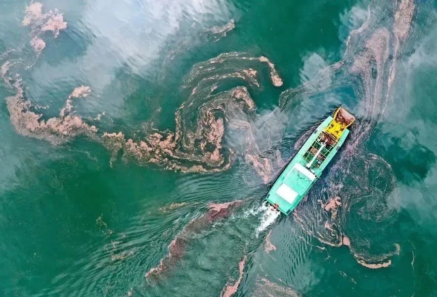△垃圾清理船在贵州黔西市乌江源百里画廊江面上清理垃圾(2022年6月2日摄)。