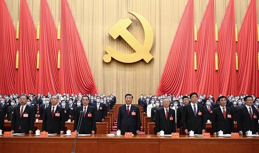10月16日,中国共产党第二十次全国代表大会在北京人民大会堂开幕。这是习近平、李克强、栗战书、汪洋、王沪宁、赵乐际、韩正、胡锦涛在主席台上。