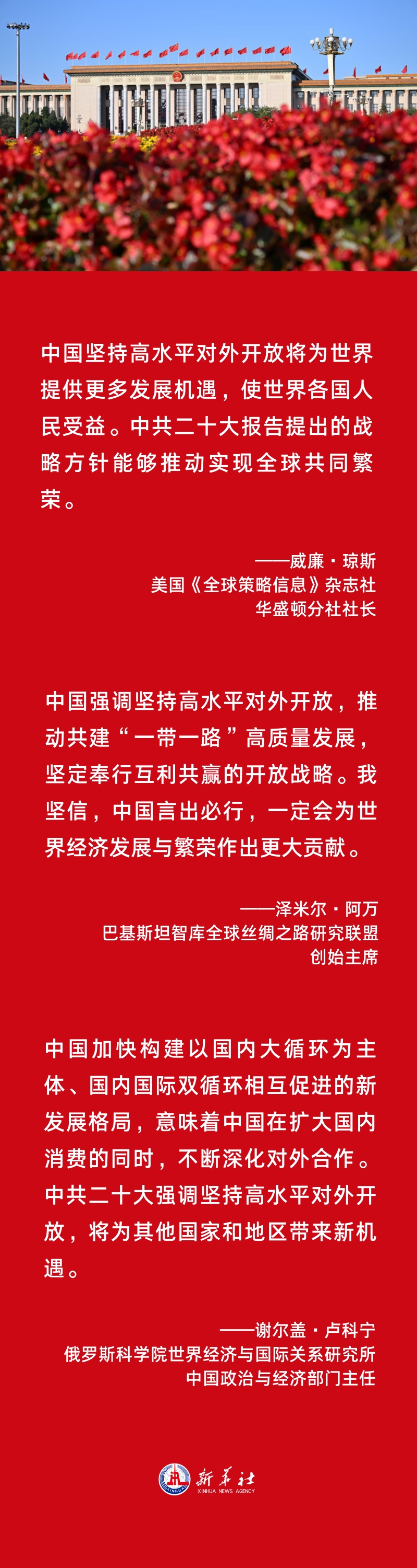 中国坚持对外开放的基本国策,坚定奉行互利共赢的开放战略,不断以中国新发展为世界提供新机遇,推动建设开放型世界经济,更好惠及各国人民。中共二十大再次向世界发出开放强音,以自身新发展为全球发展作出新贡献的决心和行动,赢得国际社会广泛赞誉和支持。