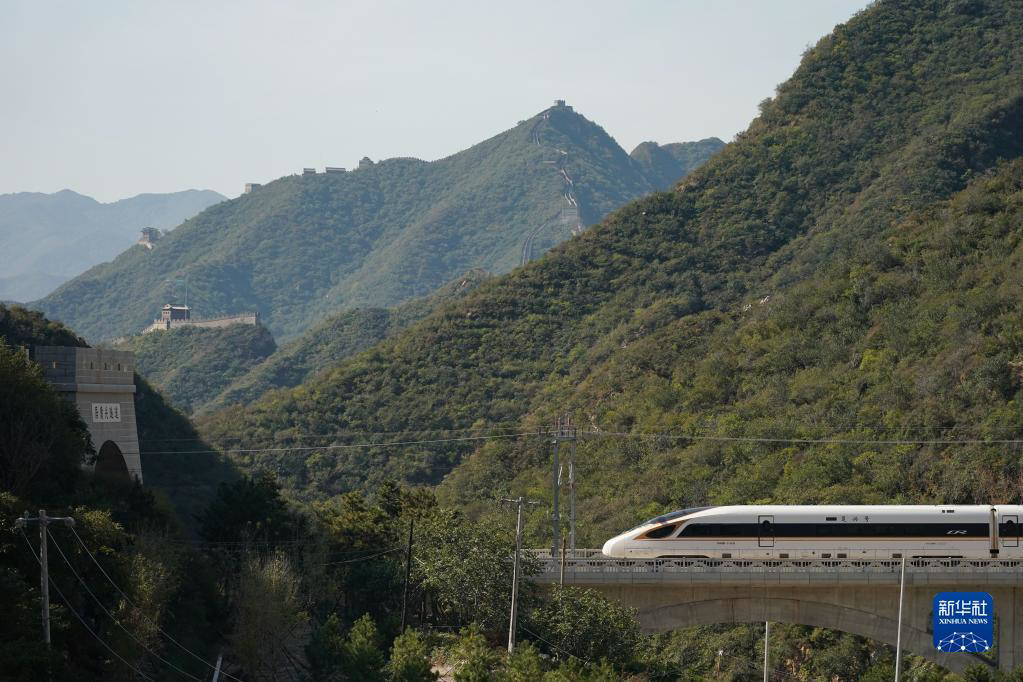 一列复兴号高铁列车从京张高铁驶过居庸关长城(2020年10月6日摄)。新华社记者 鞠焕宗 摄