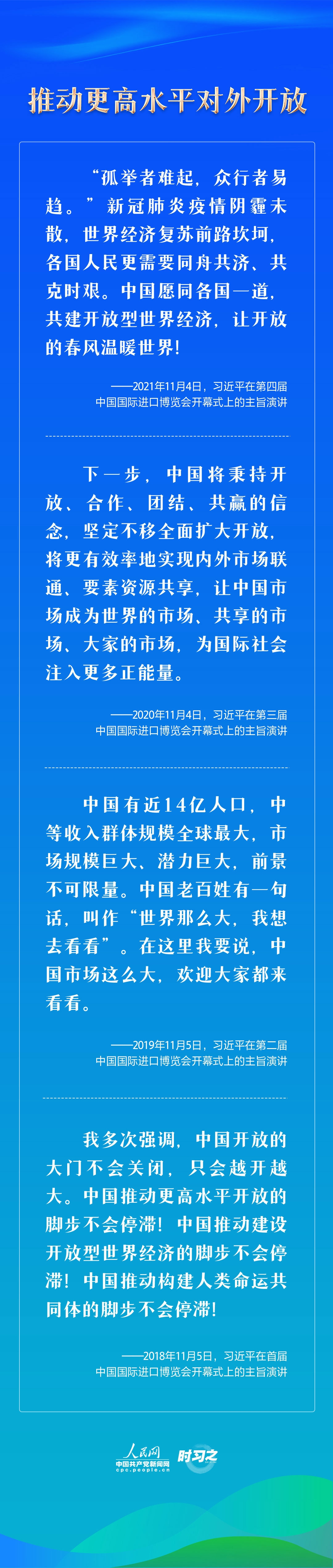 中国国际进口博览会由习近平主席亲自谋划、亲自提出、亲自部署、亲自设计、亲自推动,是迄今为止世界上第一个以进口为主题的国家级展会,每年举办一届,被外界誉为中国开放的“金色大门”。自2018年首次举办以来,习近平主席连续4年在进博会开幕式上发表主旨演讲,深刻阐释中国坚定支持经济全球化的立场主张,宣布中国持续扩大开放的一系列新举措,充分彰显中国同世界分享发展机遇的真诚愿望。