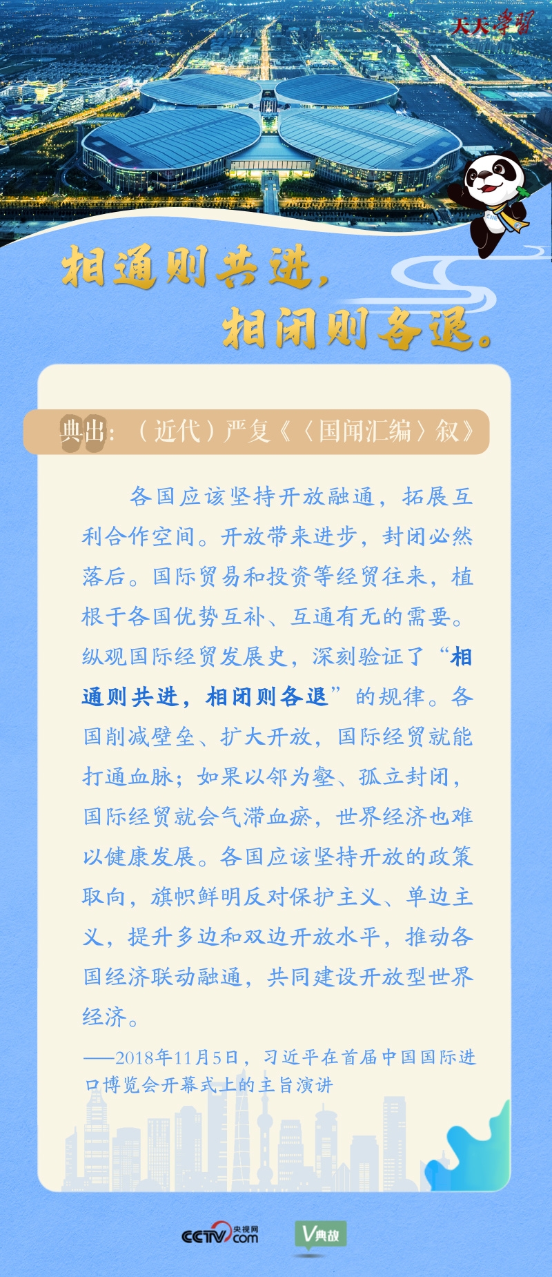 在历届进博会开幕式上,习近平主席都引经据典,强调开放合作的重要性、必要性。央视网《天天学习》栏目特选取这些用典,与您一起学习领会。
