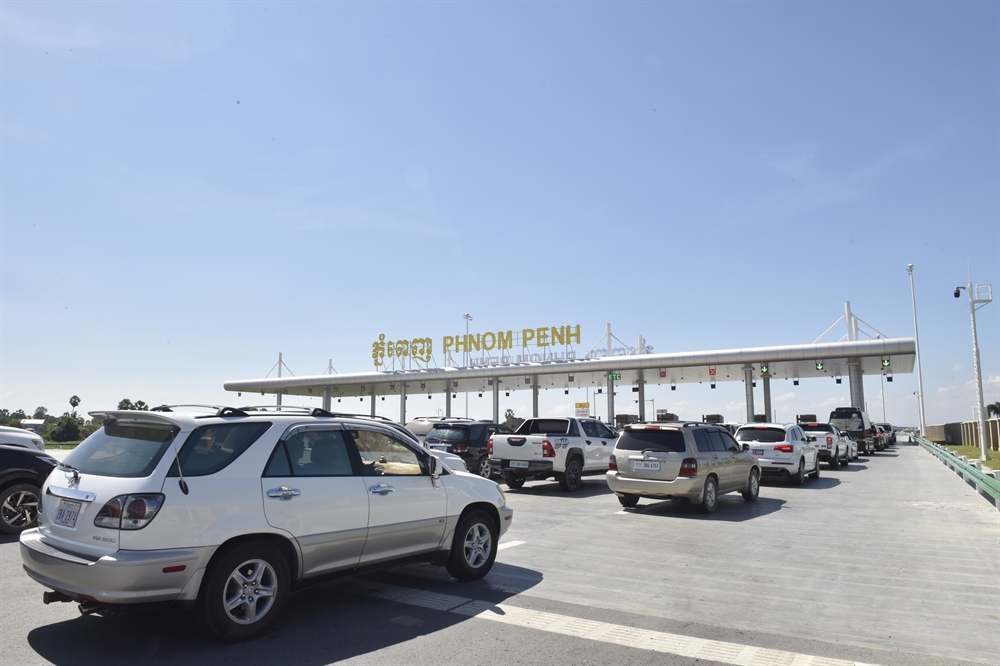 车辆在柬埔寨首都金边的金港高速公路入口处排队(2022年11月7日摄)。新华社记者 吴长伟 摄