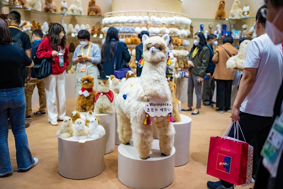 △2022年11月9日,第五届中国国际进口博览会展区正式开放。秘鲁展商的羊驼玩偶,蓬松柔软、形态各异的动物玩偶在展台“列队”,吸引大批观众前来交流洽谈。