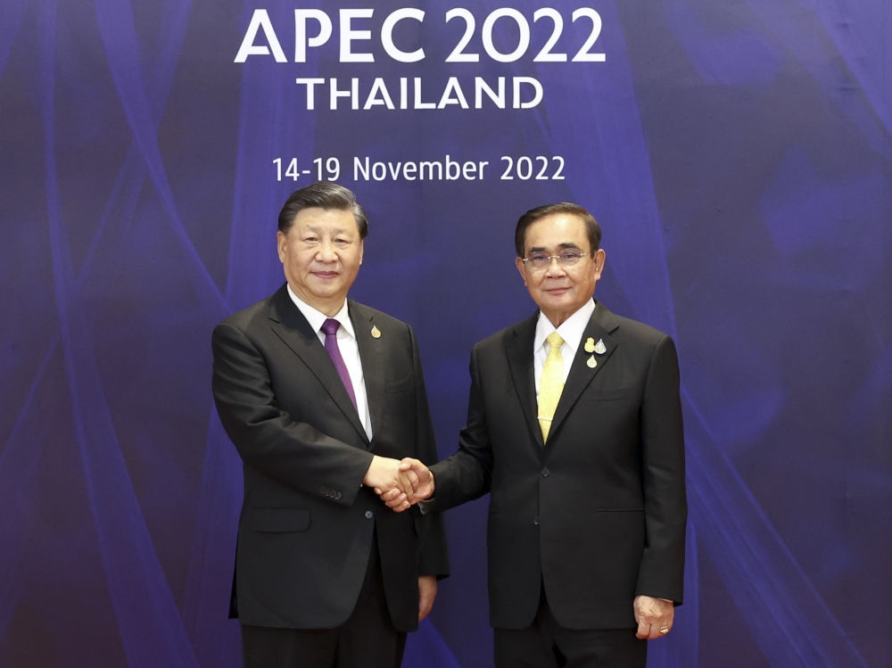 ↑这是习近平抵达会场时,受到泰国总理巴育热情迎接。