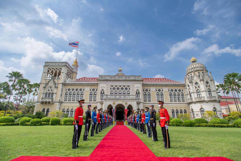习近平主席抵达总理府时,巴育热情迎接。泰国总理府高官、最高司令及陆、海、空军司令等列队欢迎。仪仗队整齐排列,行注目礼。