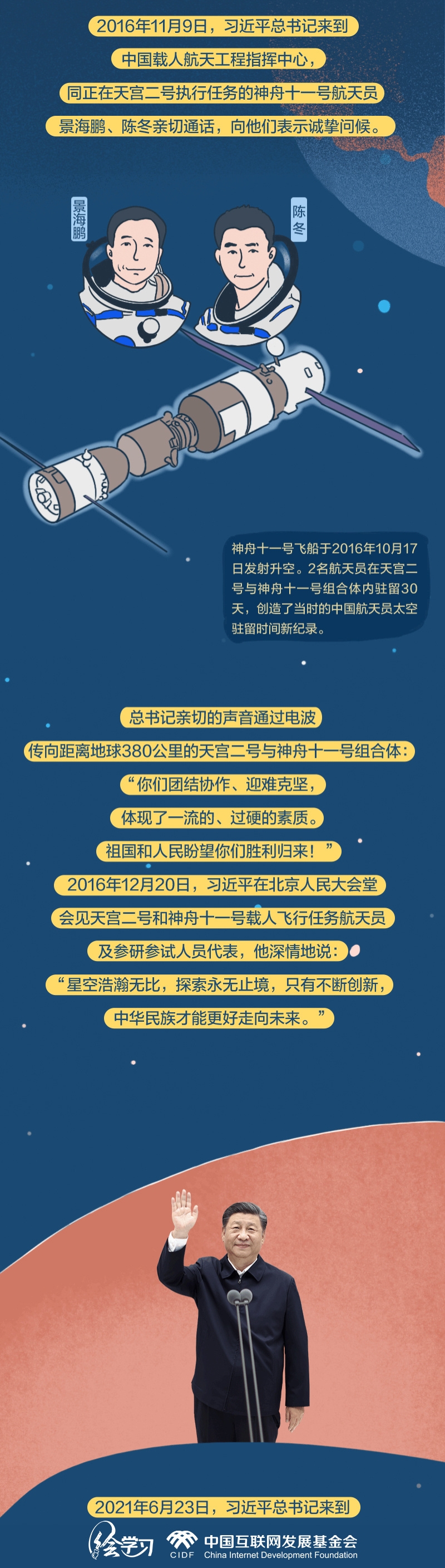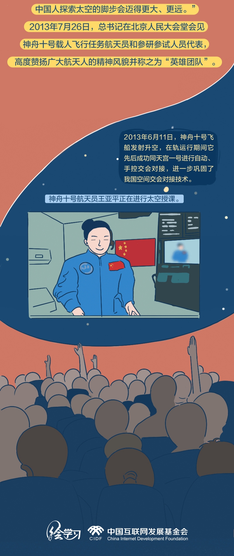 绘学习党的十八大以来,总书记始终高度关注我国航天事业发展,多次同执行任务的航天员展开“天地通话”、给参与“东方红一号”任务的老科学家回信、亲切接见航天工作者、深情寄语航天人……