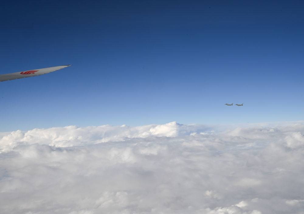 这是礼宾护卫机在空中拉出象征中国国旗的红黄两色彩带。