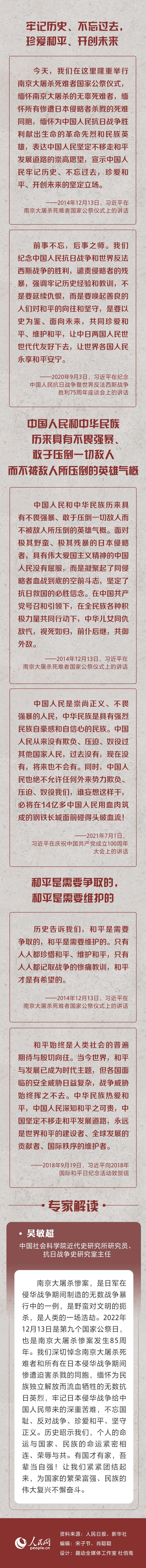 12月13日是南京大屠杀死难者国家公祭日,让我们重温习近平总书记关于“战争与和平”的论述,以尊崇之心珍视和平、以民族之力矢志复兴。