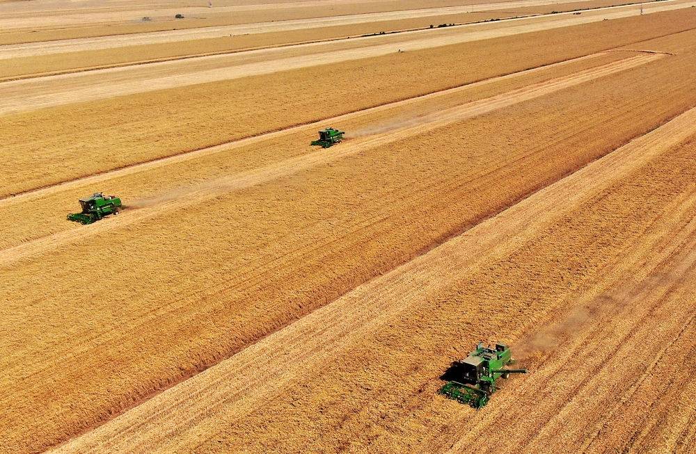 在河南省安阳市汤阴县菜园镇高标准农田示范区,收割机在麦田作业(2022年6月8日摄)。新华社记者 郝源 摄