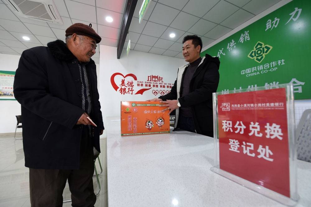 在安徽省滁州市凤阳县小岗村,村民缪守鲁(左)在村里“美德银行”用积分兑换生活物品(2021年1月30日摄)。新华社记者 周牧 摄