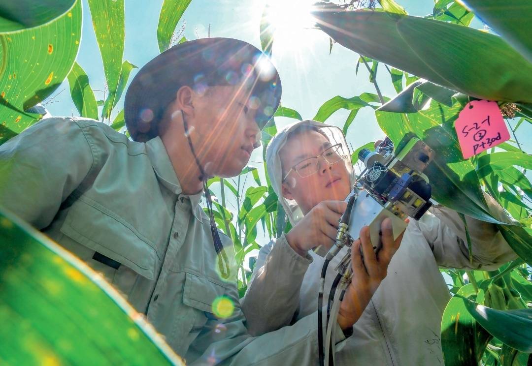 在吉林省梨树县,中国农业大学在读博士生沙野(右)和崔帅在试验田里测量玉米光合作用。(2022年8月17日摄) 张楠摄 / 本刊