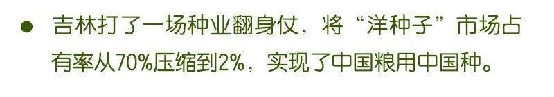 十年前,吉林一度“洋种子”遍地,市场占有率高达70%。吉林强化政策引导和金融支持,深入实施种业振兴行动,促进“育繁推”一体化,推动资金、人才等向种业集聚,瞄准关键品种,支持科企合作,打了一场种业翻身仗,将“洋种子”市场占有率压缩到2%,实现了中国粮用中国种。