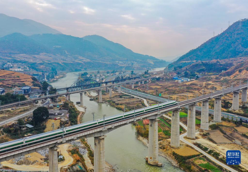 2022年12月26日,蜿蜒千里的新成昆铁路全线贯通运营。复兴号动车组从成都南站发出,沿着现代化的铁路,奔驰在崇山峻岭间。