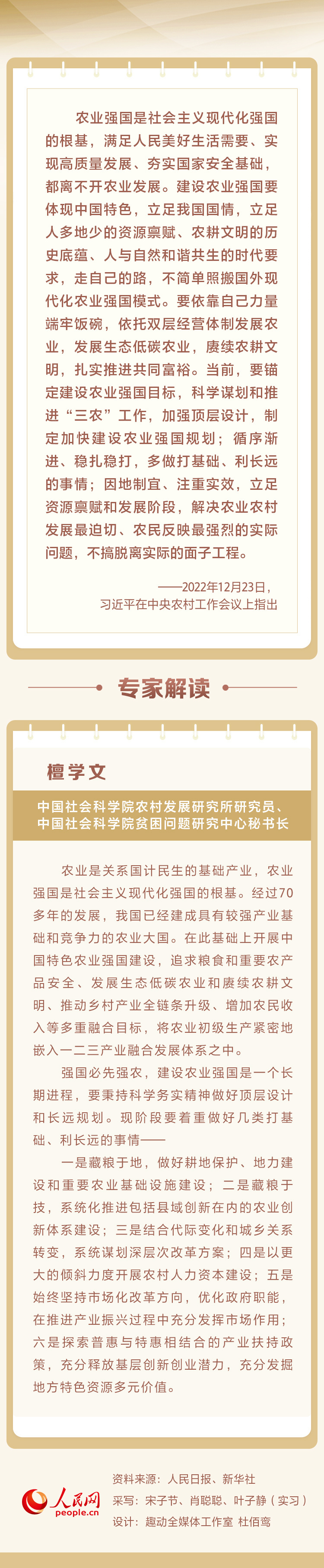 12月23日至24日,中央农村工作会议在北京举行。中共中央总书记、国家主席、中央军委主席习近平出席会议并发表重要讲话。人民网带您重温讲话要点并邀请专家进行解读。本期聚焦“建设农业强国”。