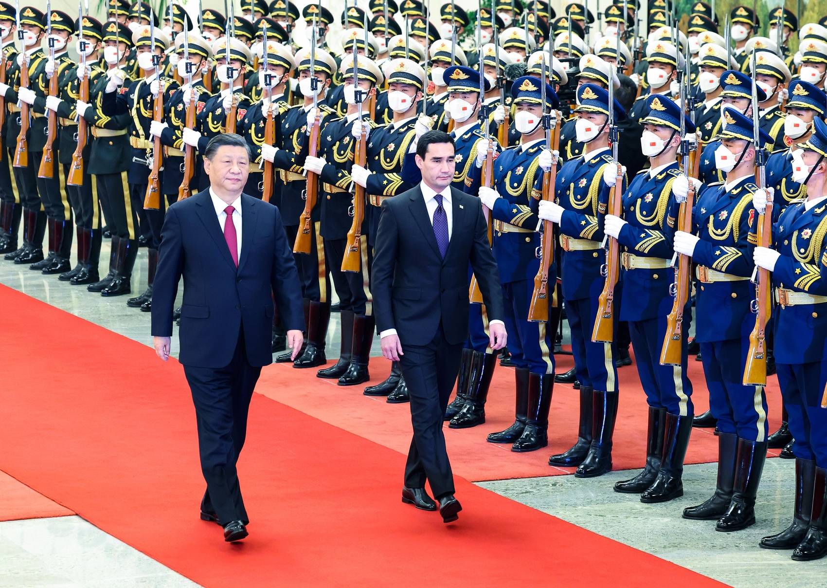 2023年1月6日,国家主席习近平在北京人民大会堂同来华进行国事访问的土库曼斯坦总统谢尔达尔·别尔德穆哈梅多夫举行会谈。这是会谈前,习近平在人民大会堂北大厅为谢尔达尔·别尔德穆哈梅多夫举行欢迎仪式。
