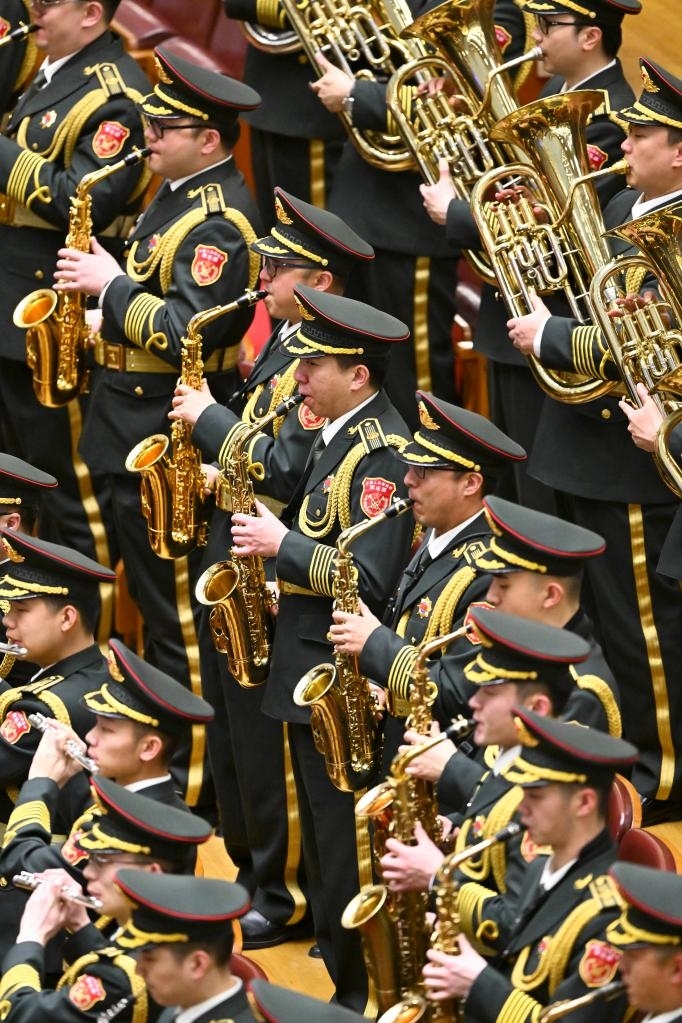 3月11日,中国人民政治协商会议第十四届全国委员会第一次会议在北京人民大会堂举行闭幕会。这是军乐团在演奏。