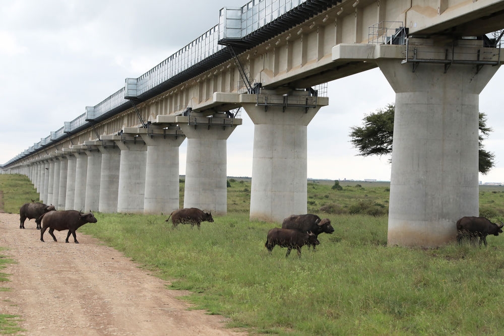 ↑水牛在装有声屏障的肯尼亚内罗毕国家公园特大桥下穿行(2021年5月19日摄)。中非共建的肯尼亚内马铁路采用特大桥全程穿越内罗毕国家公园方案,桥墩超过6米,让长颈鹿也能“昂首通过”;特大桥护栏两侧安装声屏障,极大降低火车通过时的噪音。