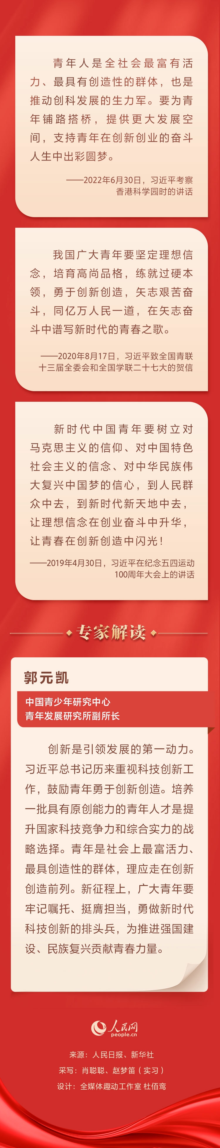 “青年是祖国的前途、民族的希望、创新的未来。”一直以来,中共中央总书记、国家主席、中央军委主席习近平鼓励青年追求梦想,让青春在创新创造中闪光。人民网邀请专家进行解读。