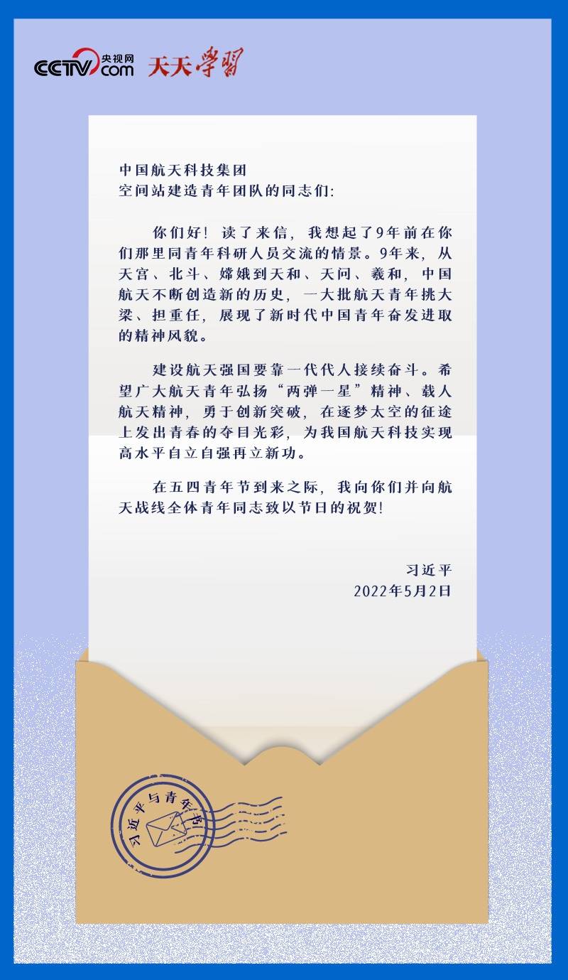 2022年5月2日,在五四青年节到来之际,中国航天科技集团空间站建造青年团队收到了一份特别的节日礼物——一封落款为“习近平”的回信。
