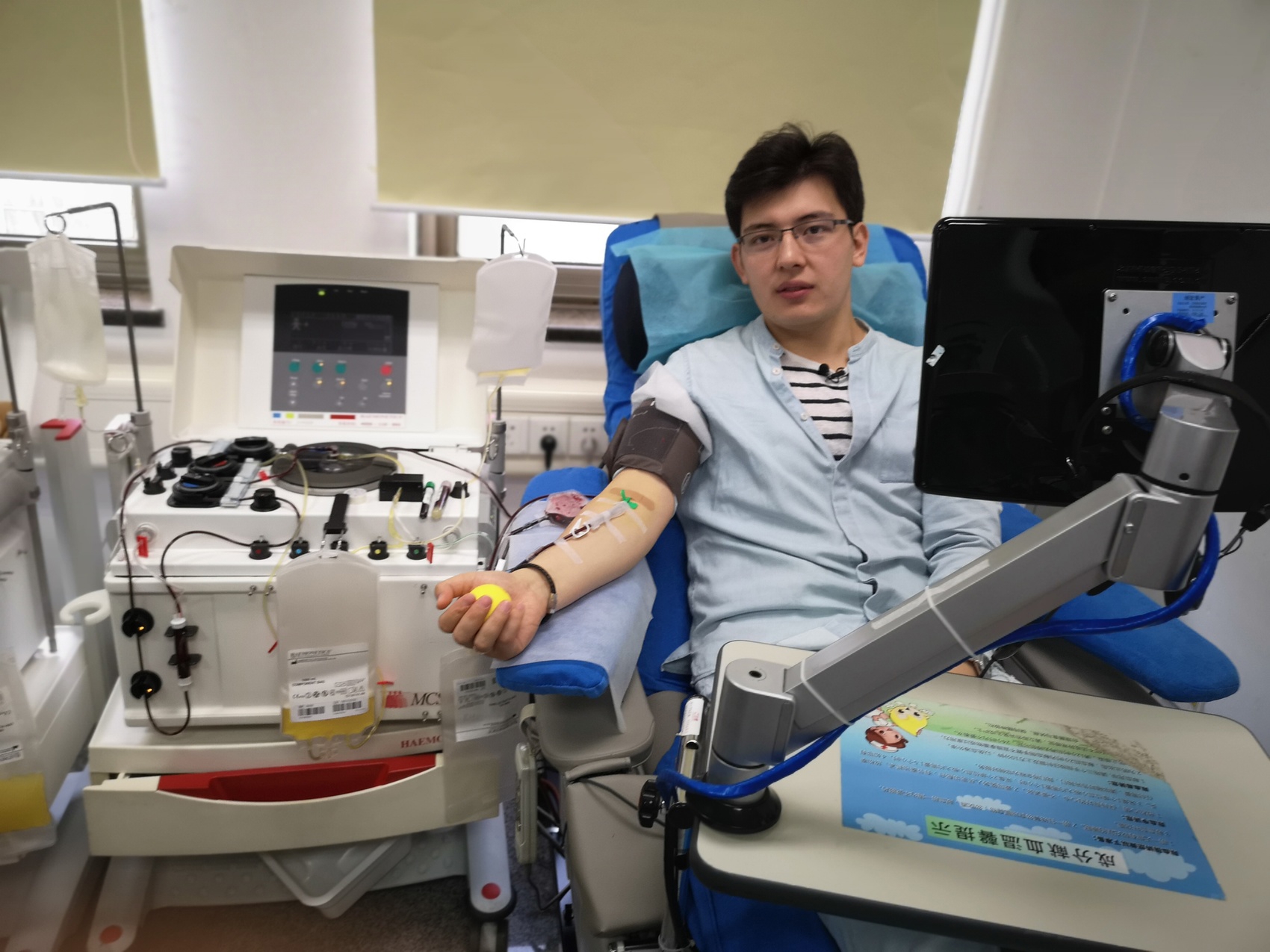 鲁斯兰在北京市红十字血液研究所献血(2018年5月22日摄)。 新华社发