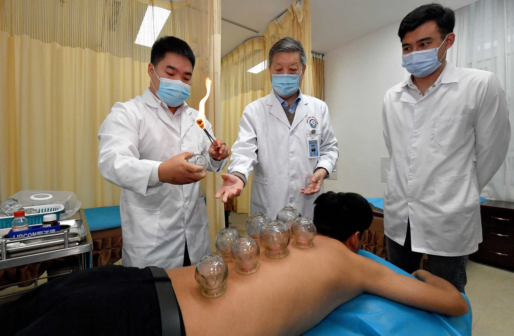 2020年11月10日,陕西中医药大学针灸推拿学院教授贾成文(中)在指导马文轩(右)进行拔罐。 新华社记者 刘潇 摄