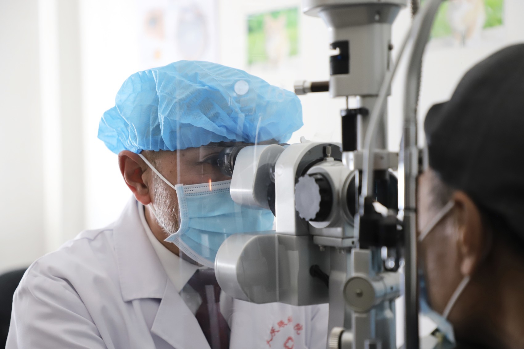 卡培拉别科夫为患者检查双眼(2020年4月11日摄)。 新华社记者 徐凯鑫 摄