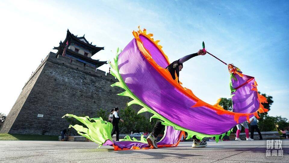 △ 清晨,西安市民在古城墙角楼下舞龙健身。(总台国广记者李晋拍摄)