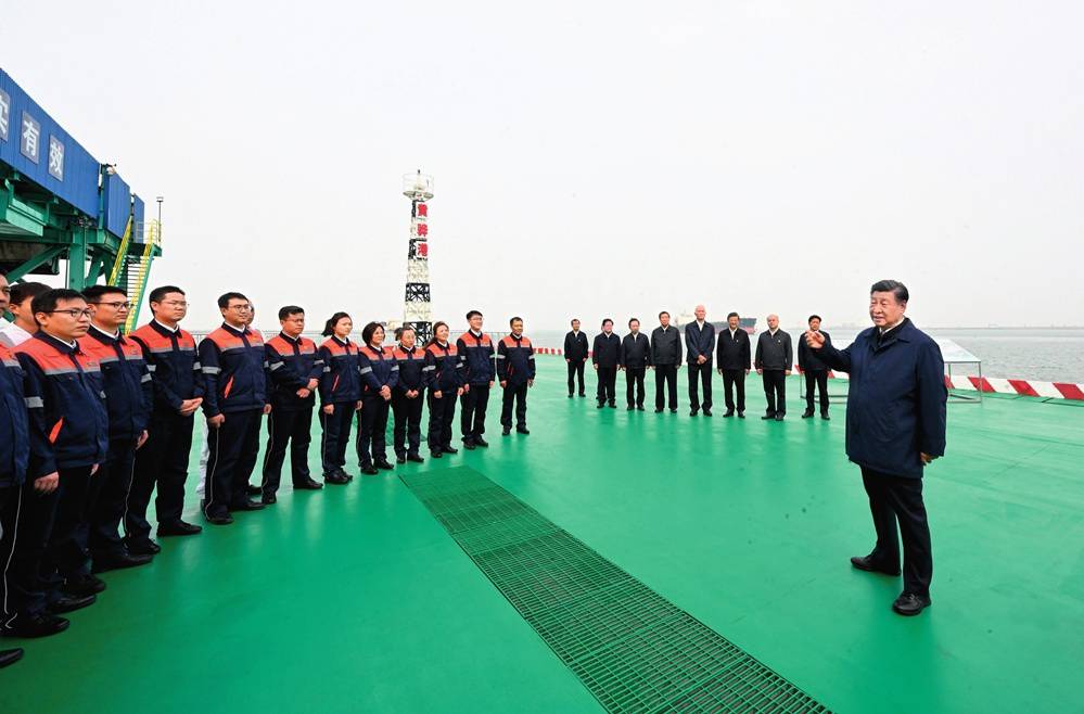 5 月 11 日至 12 日,中共中央总书记、国家主席、中央军委主席习近平在河北考察,并主持召开深入推进京津冀协同发展座谈会。这是 11 日下午,习近平在沧州市黄骅港煤炭港区码头考察时,同码头工作人员、船务人员亲切交流 李学仁摄 / 本刊