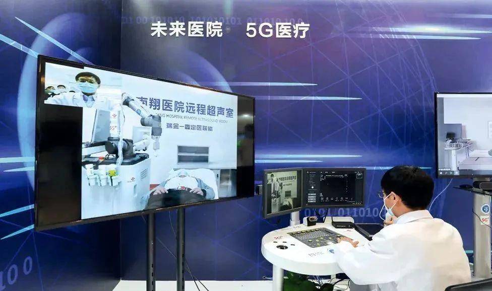 △2021年5月7日,上海瑞金医院,医生通过远程控制5G机械臂为病人做B超。
