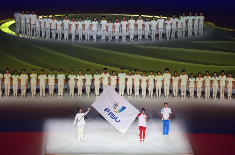 中国大学生体育代表团在开幕式上入场。