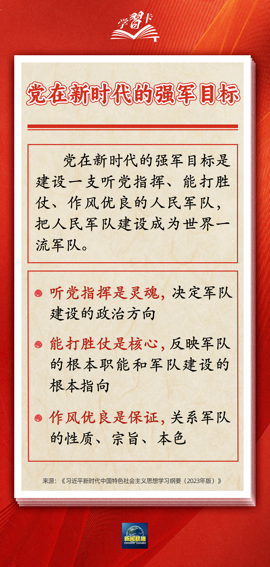 2013年3月,习近平主席提出党在新形势下的强军目标是建设一支听党指挥、能打胜仗、作风优良的人民军队。