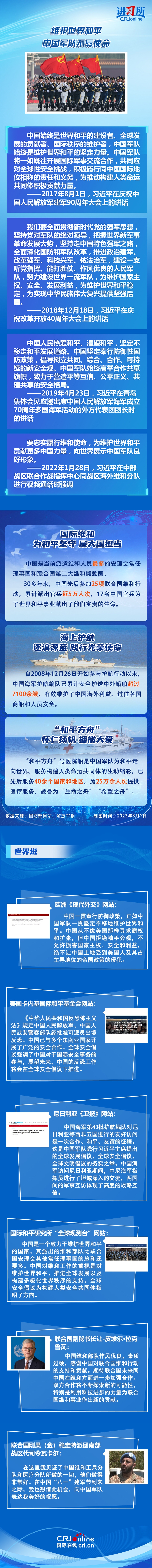【本期导读】今天是中国人民解放军建军96周年纪念日。中共十八大以来,中国军队在习近平强军思想的引领下,积极参与国际维和、海上护航、人道主义救援等行动,始终做世界和平的建设者、全球发展的贡献者、国际秩序的维护者,赢得了国际社会的肯定。