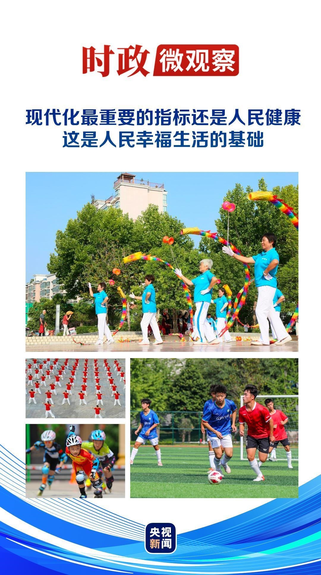 “从体育强国到健康中国,人民的健康、人民的体质、人民的幸福,都是一脉相承的。这是全面小康、全面现代化的题中之义。它的意义,小中见大。”习近平总书记统揽全局、系统谋划新时代全民健身事业,作出加快建设体育强国的重大决策部署。