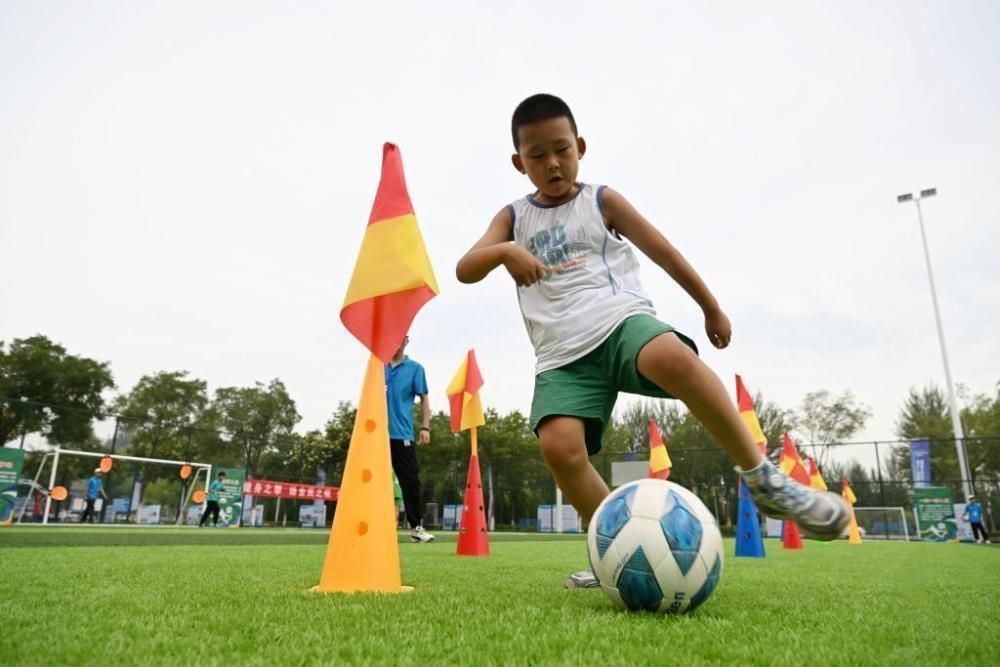 △2023年8月6日,一位小朋友在宁夏全民健身日主题示范系列活动现场体验趣味足球。