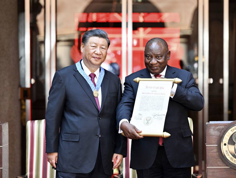 当地时间8月22日上午,正在南非进行国事访问的国家主席习近平在比勒陀利亚总统府同南非总统拉马福萨会谈。会谈后,拉马福萨向习近平授予“南非勋章”,这是南非授予重要友好国家元首的最高级别勋章和最高荣誉。新华社记者 殷博古 摄