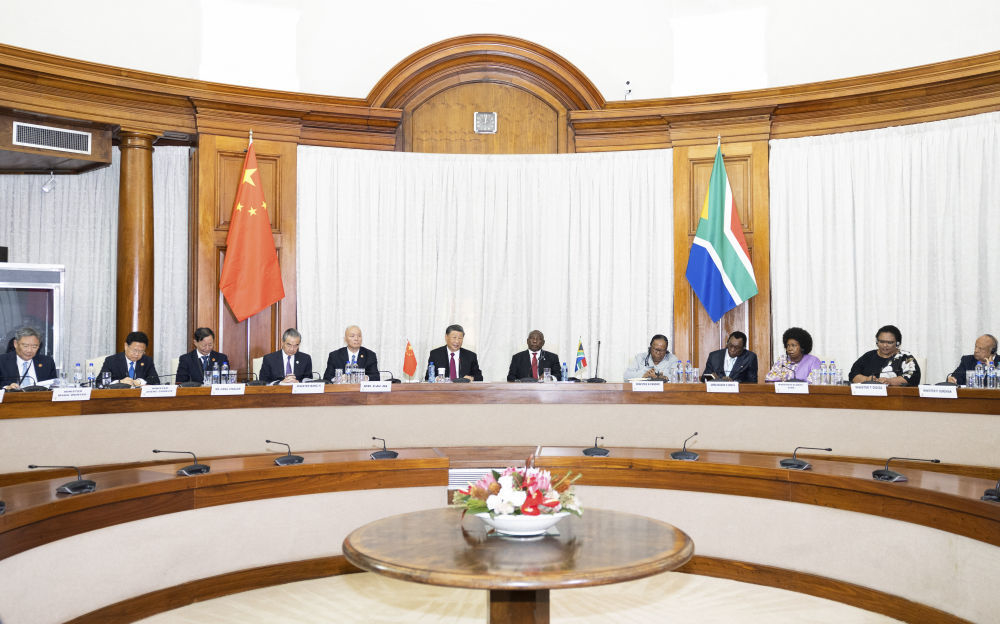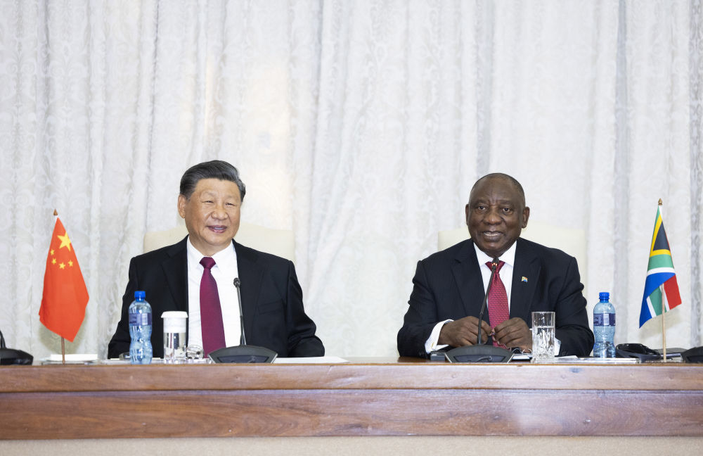 当地时间8月22日上午,正在南非进行国事访问的国家主席习近平在比勒陀利亚总统府同南非总统拉马福萨会谈。新华社记者 黄敬文 摄
