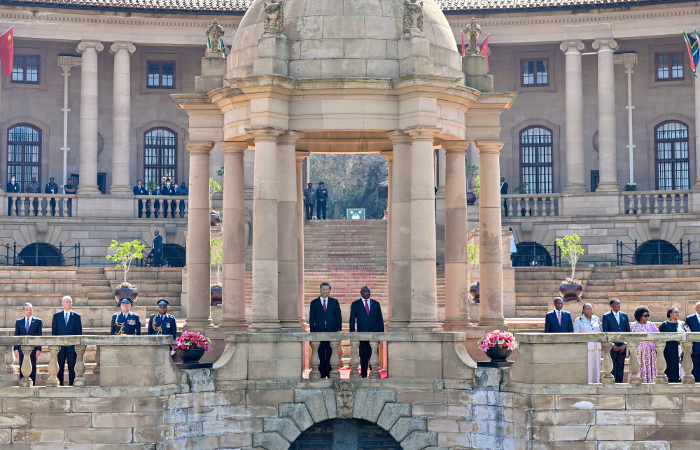 当地时间8月22日上午,正在南非进行国事访问的国家主席习近平在比勒陀利亚总统府同南非总统拉马福萨会谈。会谈前,拉马福萨在总统府广场为习近平举行欢迎仪式。新华社记者 殷博古 摄