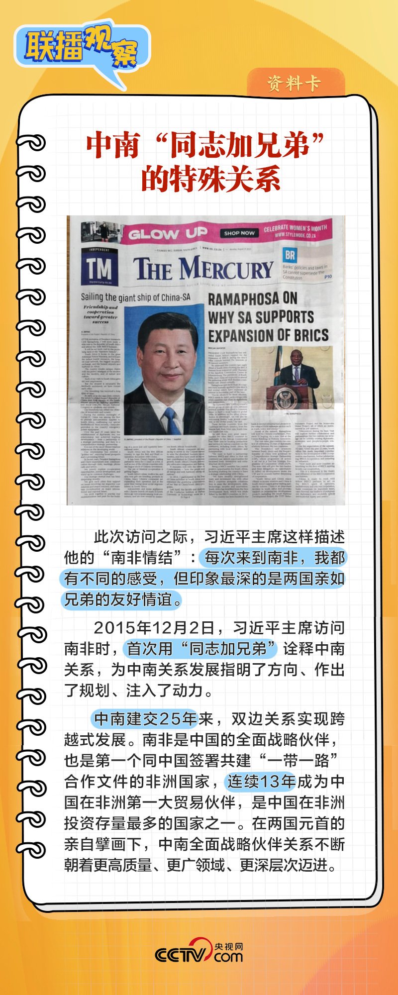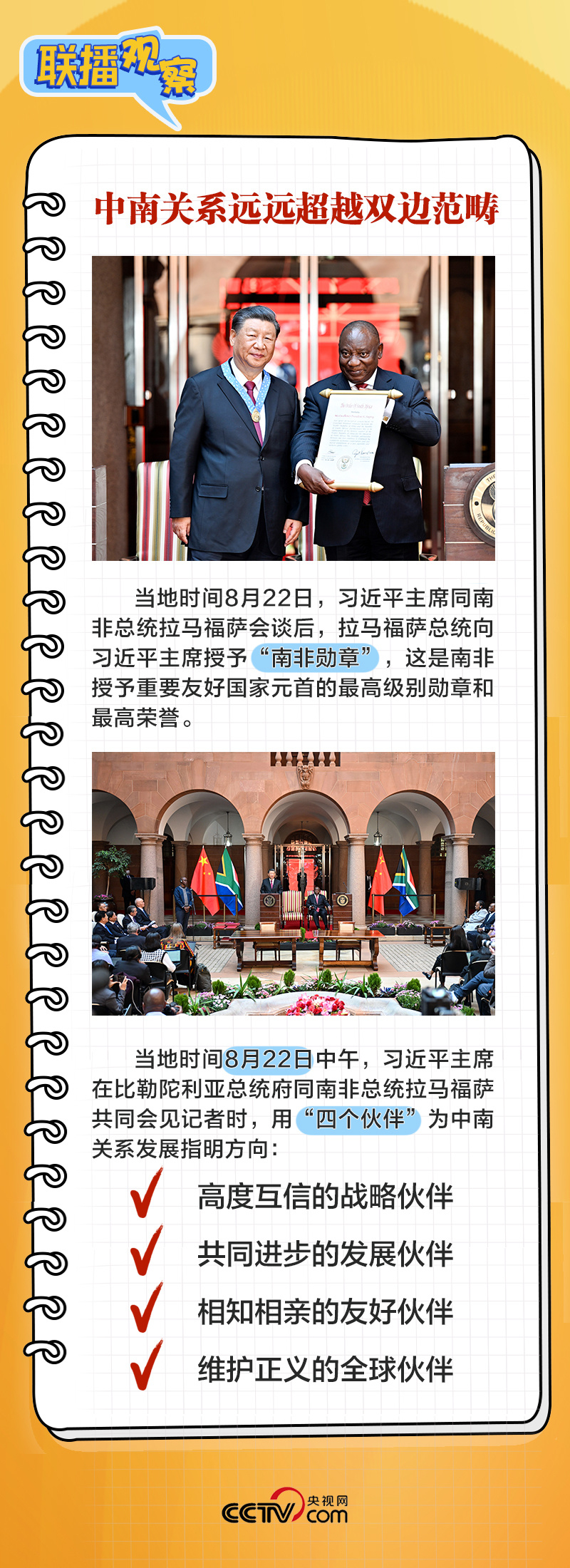 8月22日上午,在同南非总统拉马福萨举行会谈时,习主席表示:“中南关系之所以好、中南友谊之所以深,关键在于两国两党在各自发展道路上休戚与共,结下了同志加兄弟的深厚友谊。”