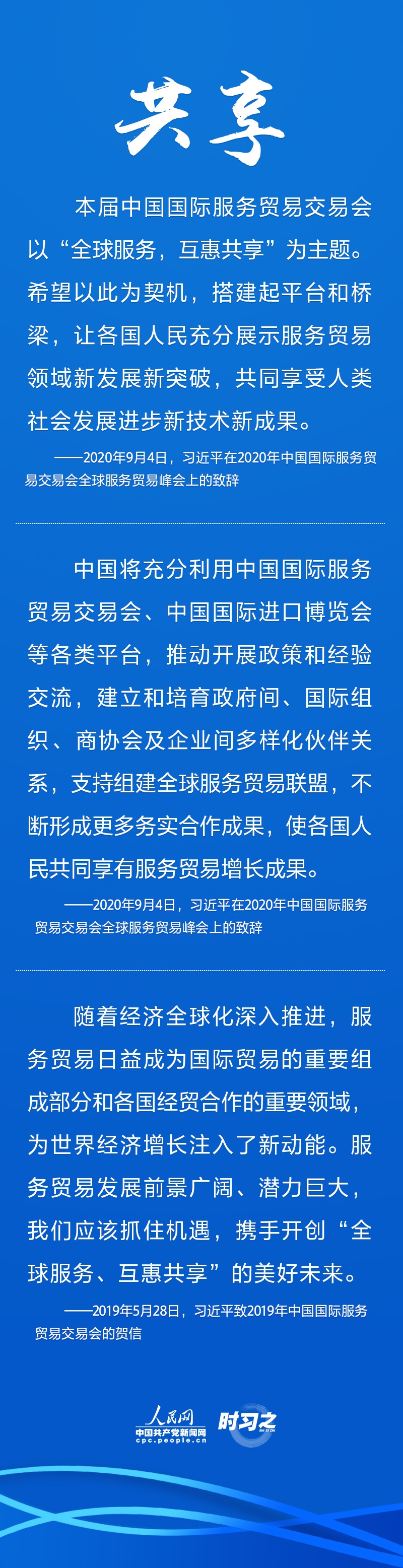 9月2日至6日,以“开放引领发展,合作共赢未来”为主题的2023年中国国际服务贸易交易会将在北京举办。“开放”“合作”“共享”……国家主席习近平向服贸会致贺信或在服贸会全球服务贸易峰会上发表致辞,多次提到这三个关键词,阐释了服贸会的积极意义和重要作用,展现了中国坚持以高水平开放促进高质量发展的决心,表达中国同世界各国一道促进服务经济开放共享、推动世界经济复苏发展的愿望。