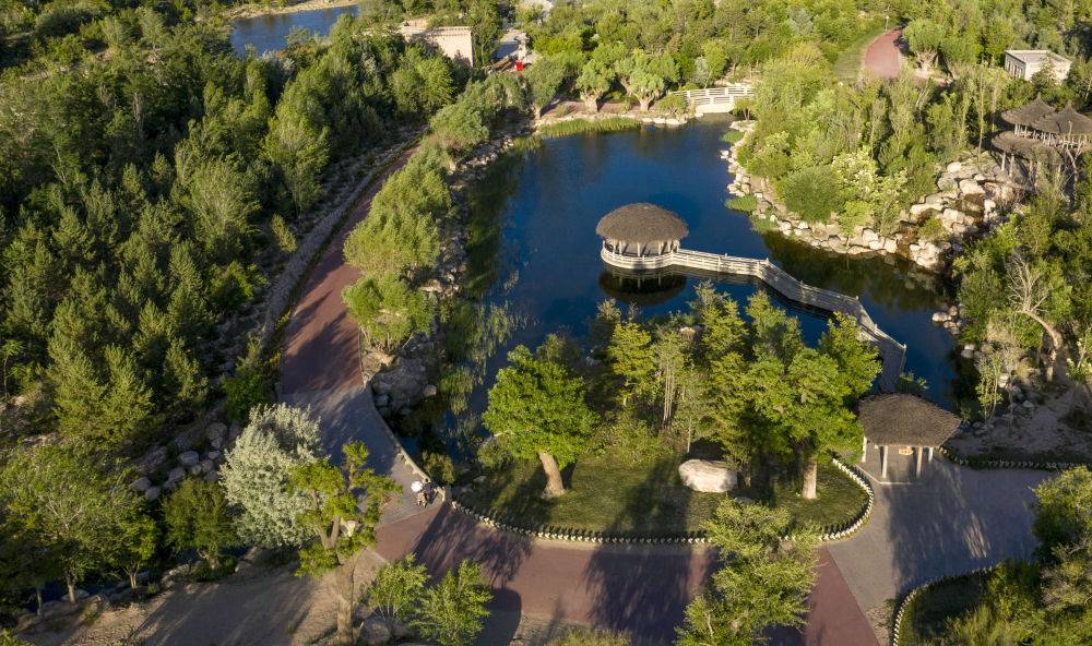坐落在宁夏银川市贺兰山脚下的贺兰山运动休闲公园(2021年5月27日摄,无人机照片)。这里曾是一片砂石采矿塌陷区,当地通过植被景观再造、水系建设、现代管网铺建等手段,重新利用废石、废坑及各类废弃建筑材料,把这里变成一座免费开放的主题公园。新华社记者 冯开华 摄