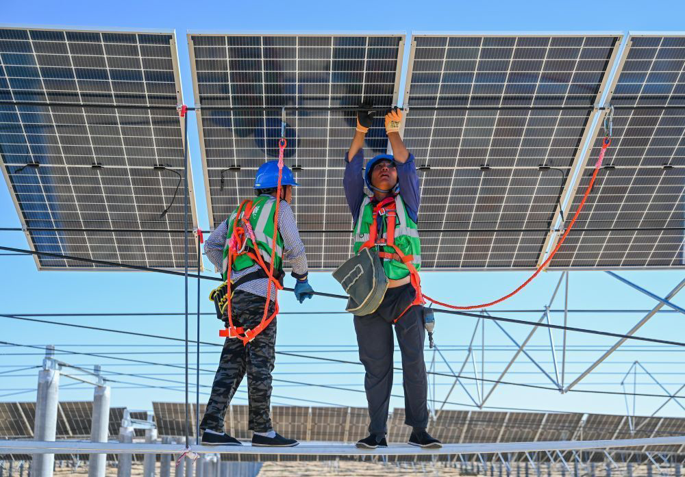 2023年7月22日,工人在位于内蒙古杭锦旗库布其沙漠亿利生态示范区的蒙西基地库布其200万千瓦光伏治沙项目工地安装光伏板。新华社记者 刘磊 摄