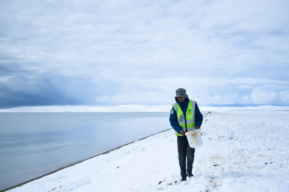 2021年10月20日,在青海省果洛藏族自治州玛多县扎陵湖乡勒那村,三江源国家公园黄河源园区生态管护员在扎陵湖边捡拾垃圾。新华社记者 张龙 摄