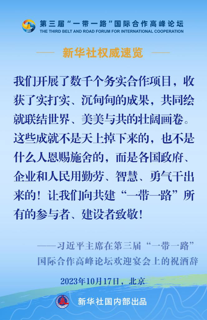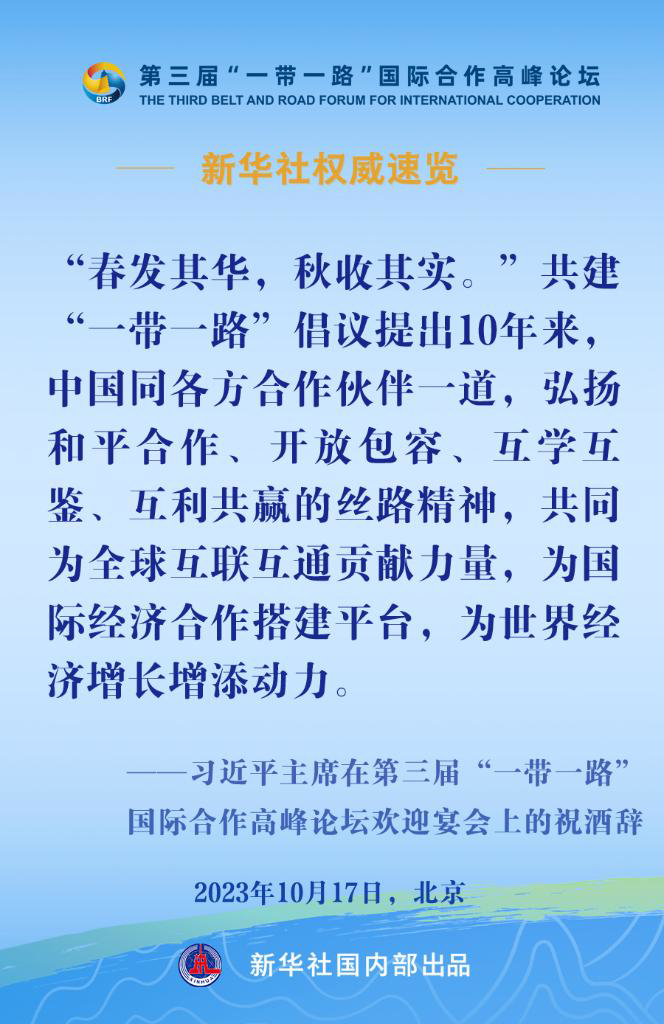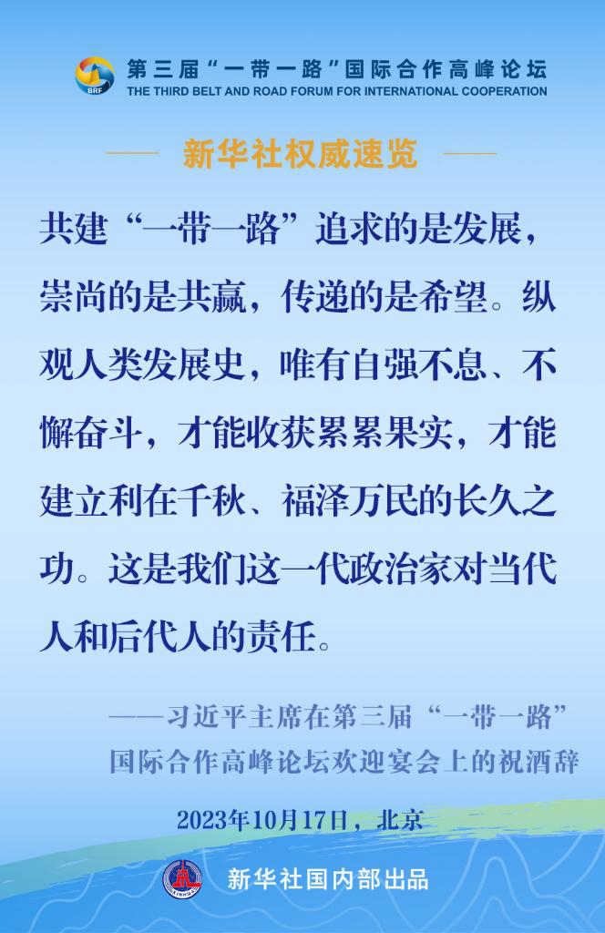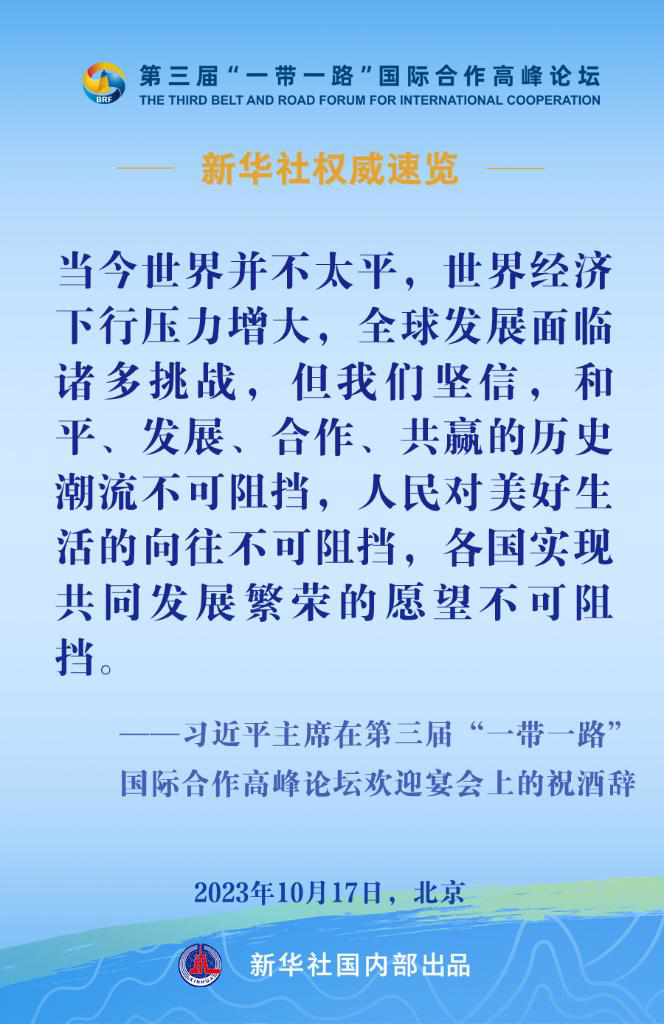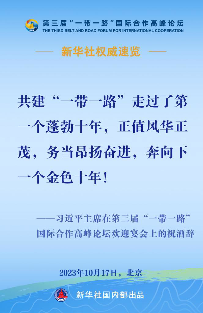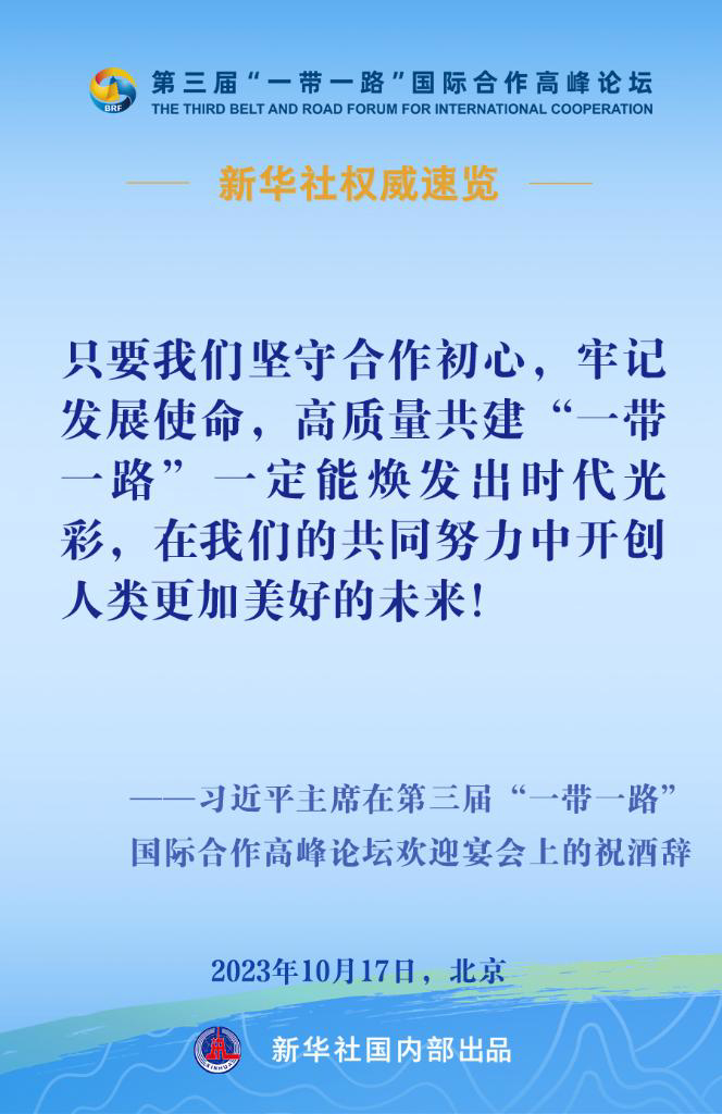 10月17日,国家主席习近平在第三届“一带一路”国际合作高峰论坛欢迎宴会上发表致辞。一起来看金句。