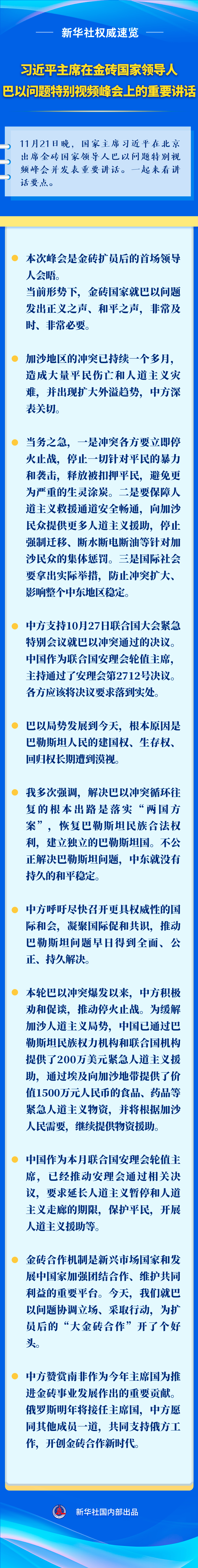 新华社权威速览丨习近平主席在金砖国家领导人巴以问题特别视频峰会上的重要讲话