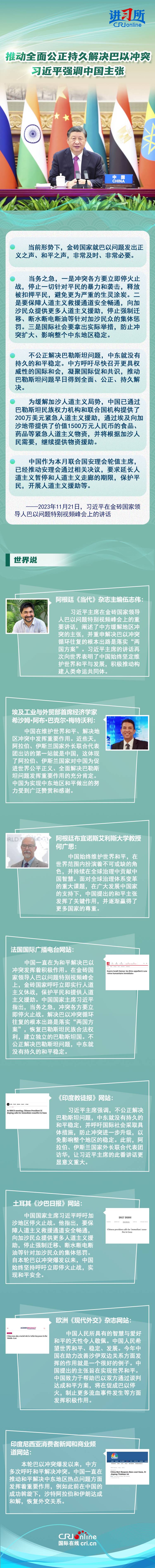 11月21日晚,中国国家主席习近平出席金砖国家领导人巴以问题特别视频峰会并发表重要讲话,呼吁冲突各方立即停火止战。中方呼吁尽快召开更具权威性的国际和会,凝聚国际促和共识,推动巴勒斯坦问题早日得到全面、公正、持久解决。