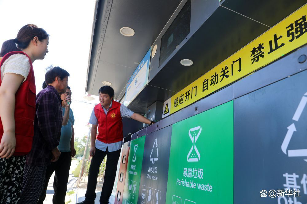 在安徽省合肥市长丰县庄墓镇枣林社区,志愿者指导居民使用智能垃圾分类回收设备(2023年9月1日摄)。新华社记者 曹力 摄