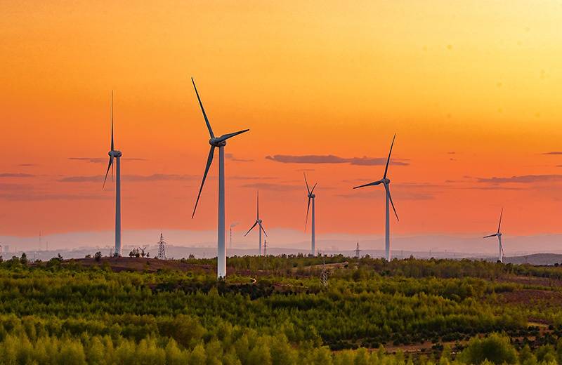 2023年5月23日清晨拍摄的内蒙古兴安盟乌兰浩特市呼和马场风力光伏发电场内的风机。
