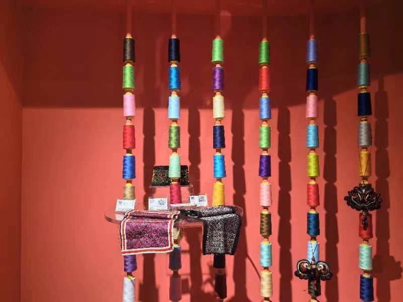 贵州省民族博物馆内展示的色彩斑斓的苗绣原材料及绣片(2024年4月27日摄)。新华社记者 杨欣 摄